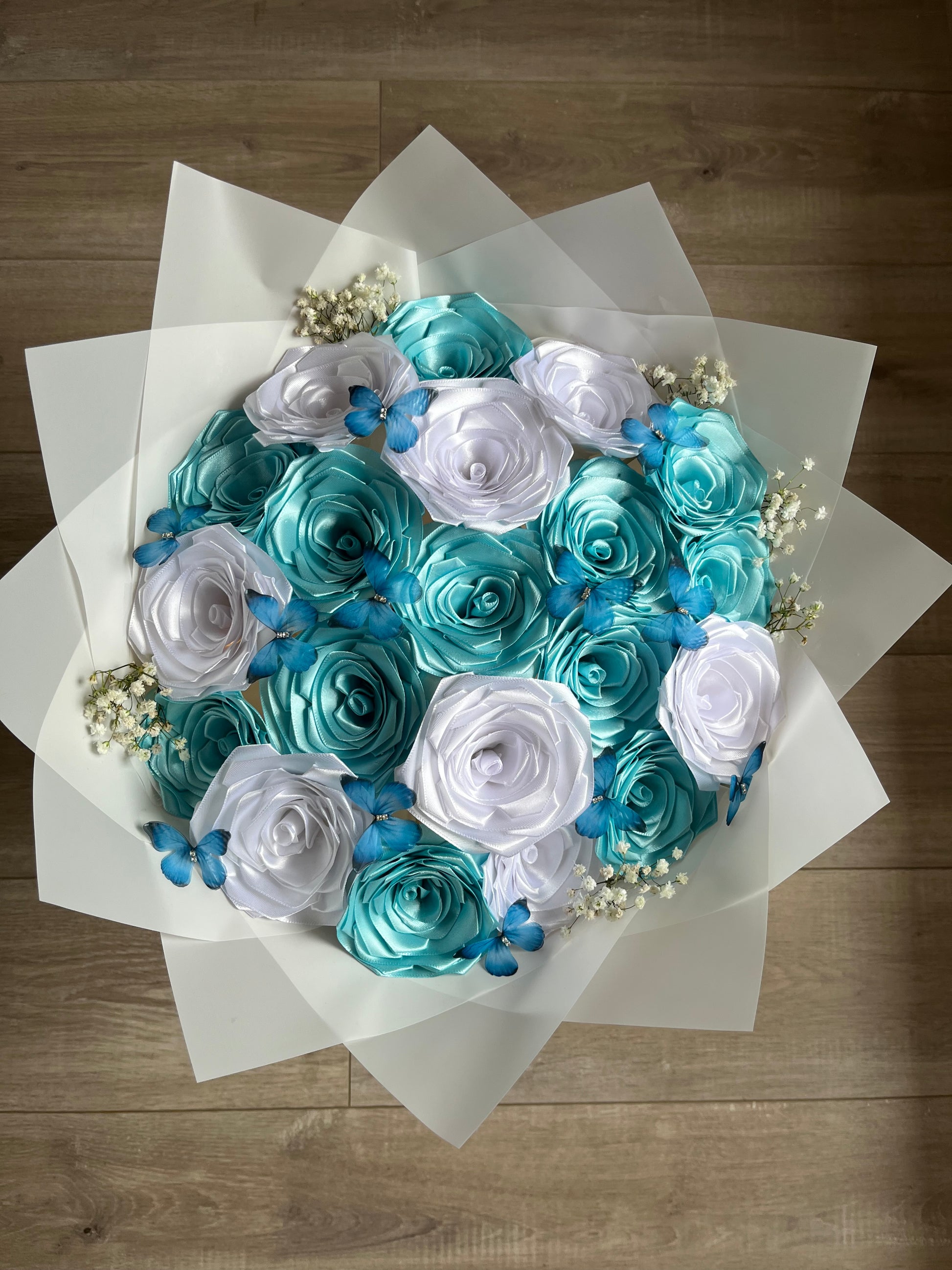 Découvrez notre bouquet couleur azur, une création élégante où la fraîcheur des fleurs se marie à la légèreté des papillons. Une composition raffinée, idéale pour offrir ou sublimer votre intérieur.