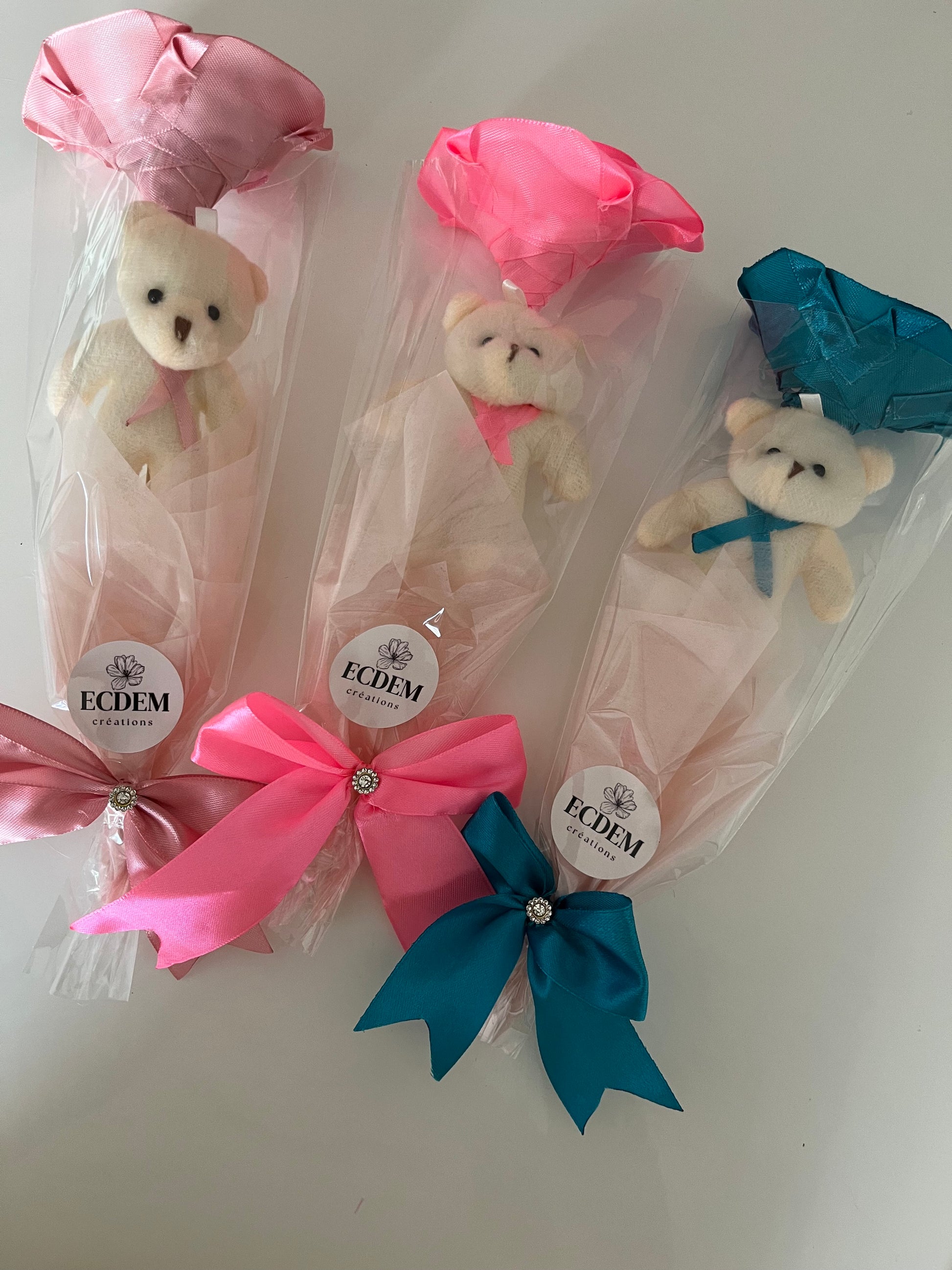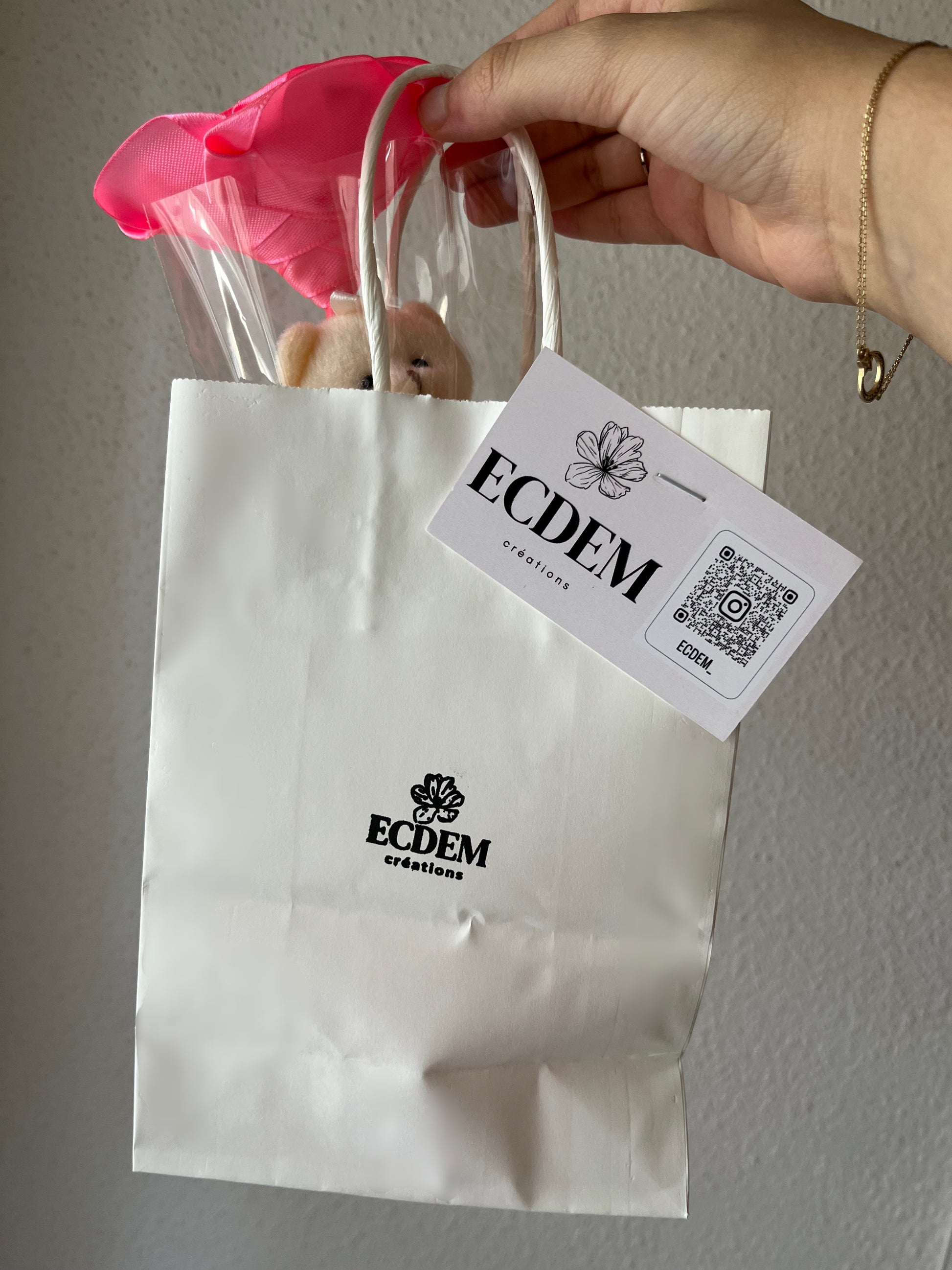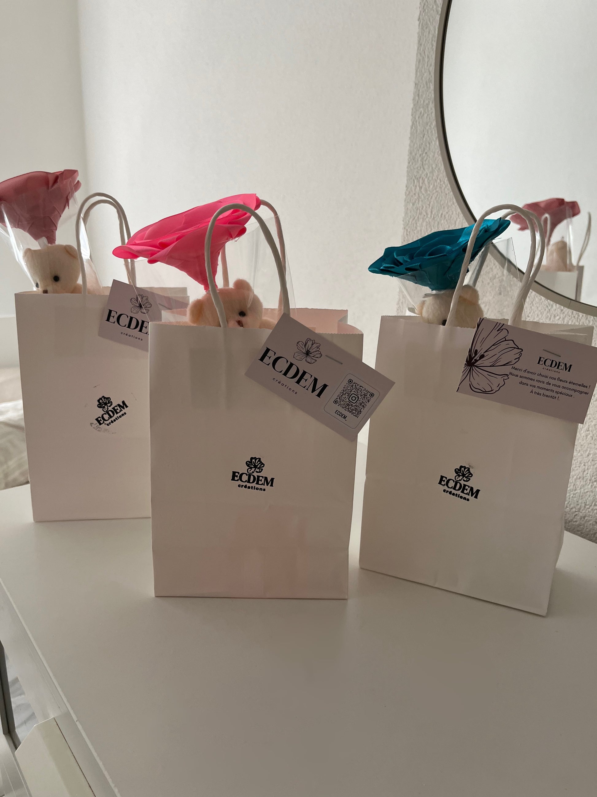 Cet adorable ourson en peluche est accompagné d’une rose éternelle, symbole d’un amour qui ne s’efface pas, le tout présenté avec son sac cadeau raffiné.